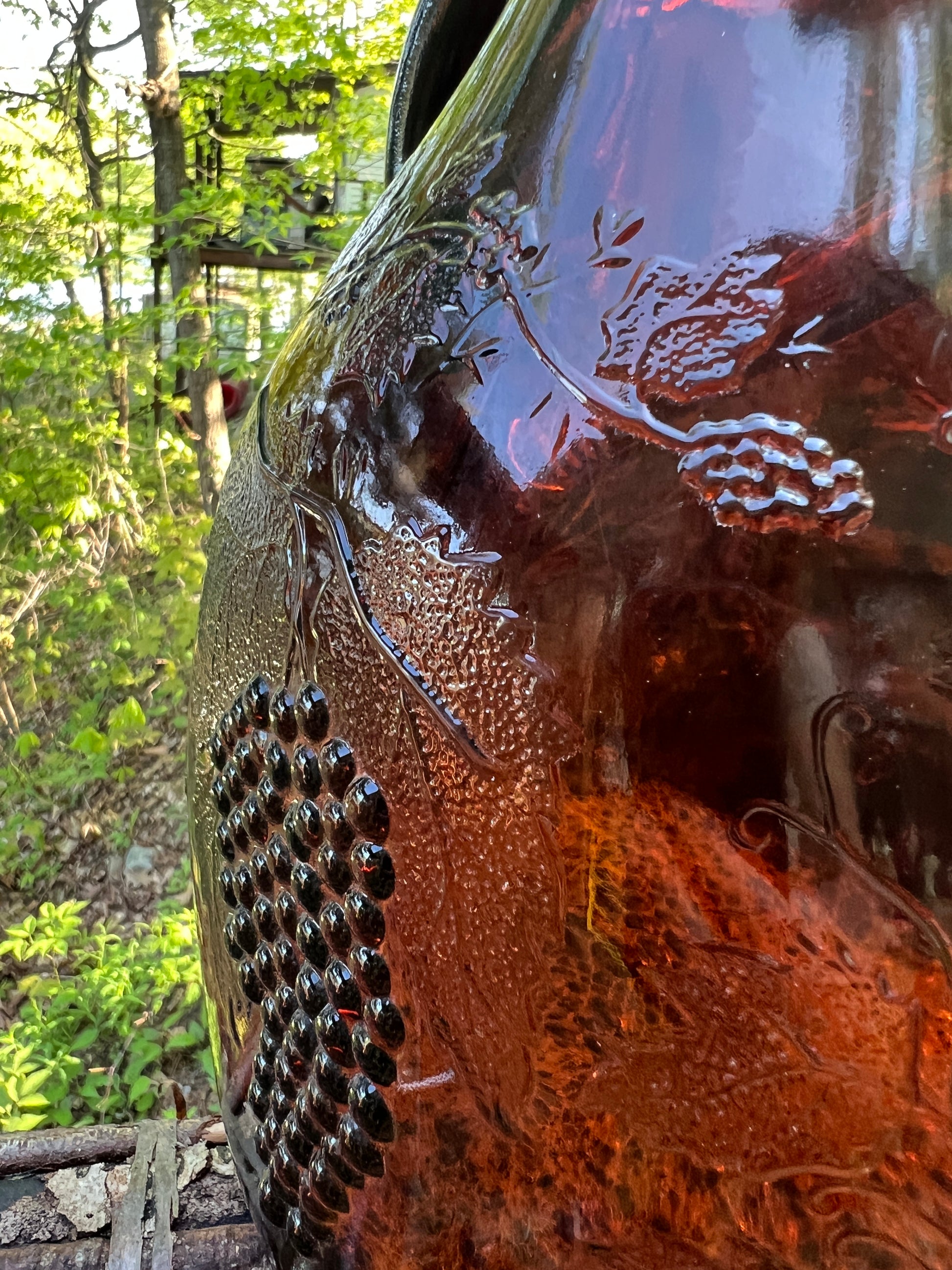 Big Awesome old one gallon wine jug from the 1930s gone Bongo! molded vines and grapes provide visual beauty. Deep warm amber color. Just. So. Pretty! One foot tall, 8" wide and a good 6" in girth. This jug is solid handle feels great in the hand!