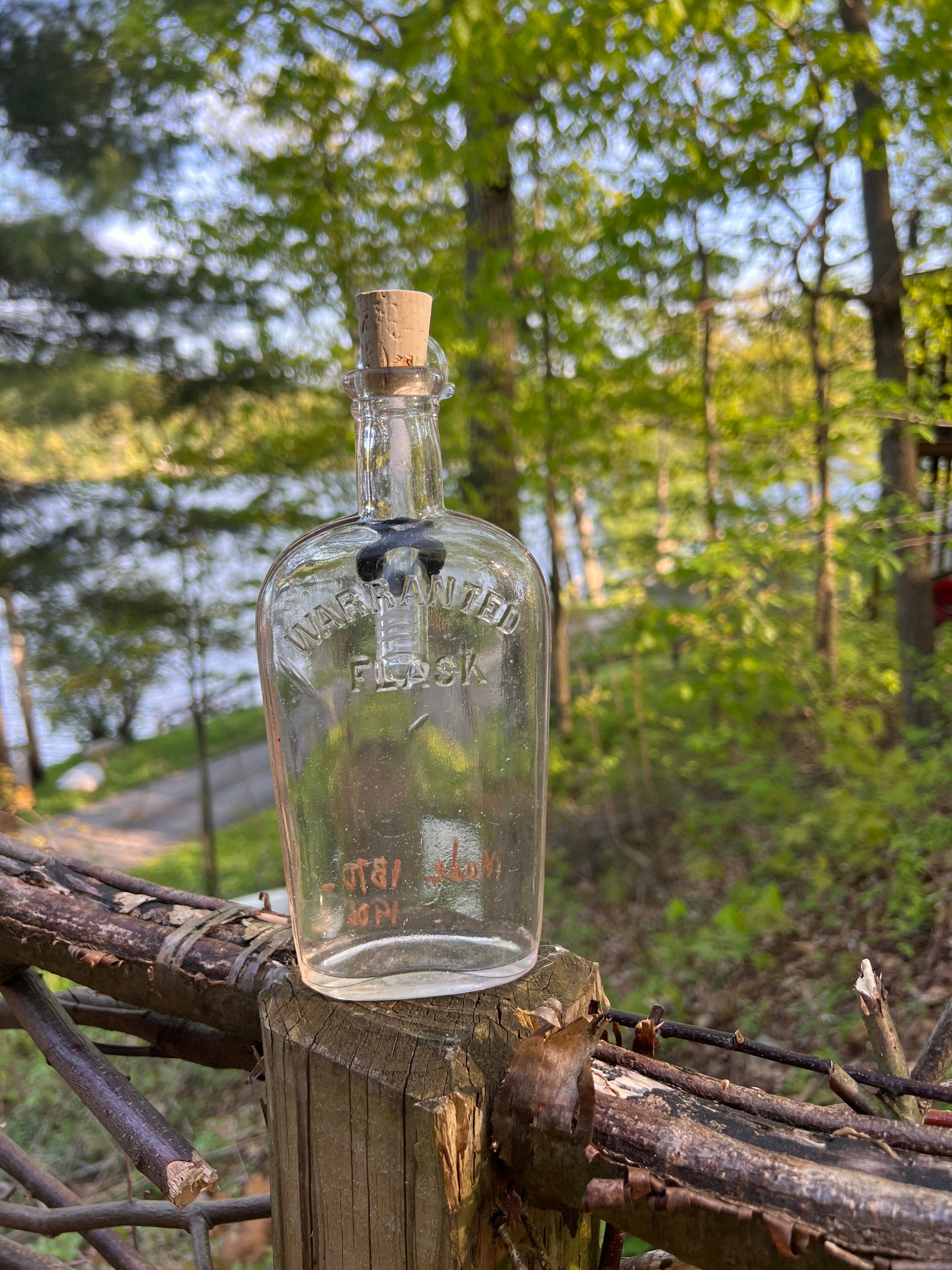 The Warranted flasks were made from 1870-1900 to hold whiskey. This bottle has a textured exterior and a flattened shape making it easy to hold. Made in America back when Americans made beautiful things as a general rule. Sigh. Anyway, appreciate your flowers in this beauty.